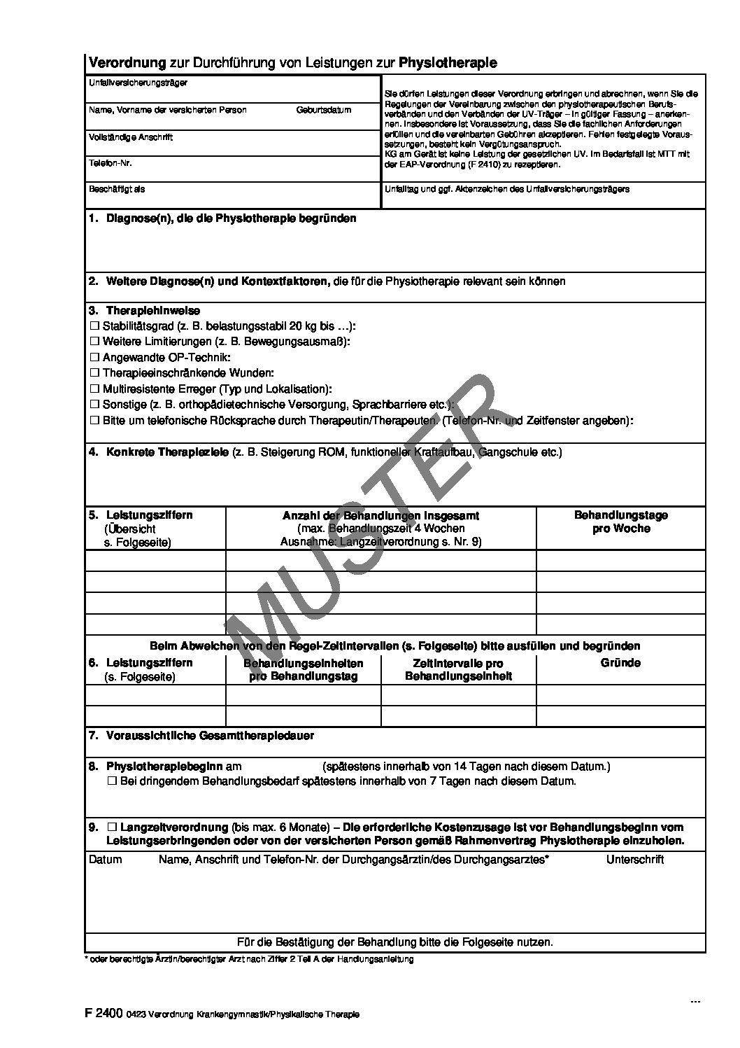 Physiotherapie/Krankengymnastik nach einem BG-Unfall (durch einen Betriebs-, Schul- oder Wegeunfall) wird von der Berufsgenossenschaft (BG) bezahlt. Es ist ein spezielles BG-Rezept vom Durchgangsarzt (D-Arzt) erforderlich. (siehe Foto)